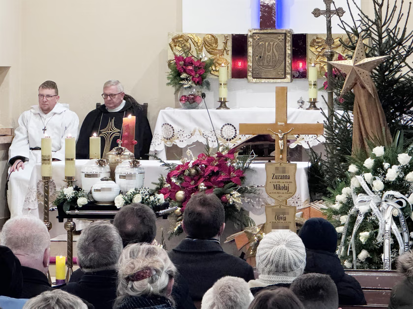 Przed południem, do małego kościoła zaczęli schodzić się mieszkańcy, przyjaciele, sąsiedzi i ci, których poruszyła tragedia z Chełmna. Przed ołtarzem ustawiono cztery urny. Jedną — złotą, w której spoczywały prochy matki. I trzy białe, należące do dzieci. Widok, który ścisnął za gardło nawet tych, którzy przyszli w milczeniu.